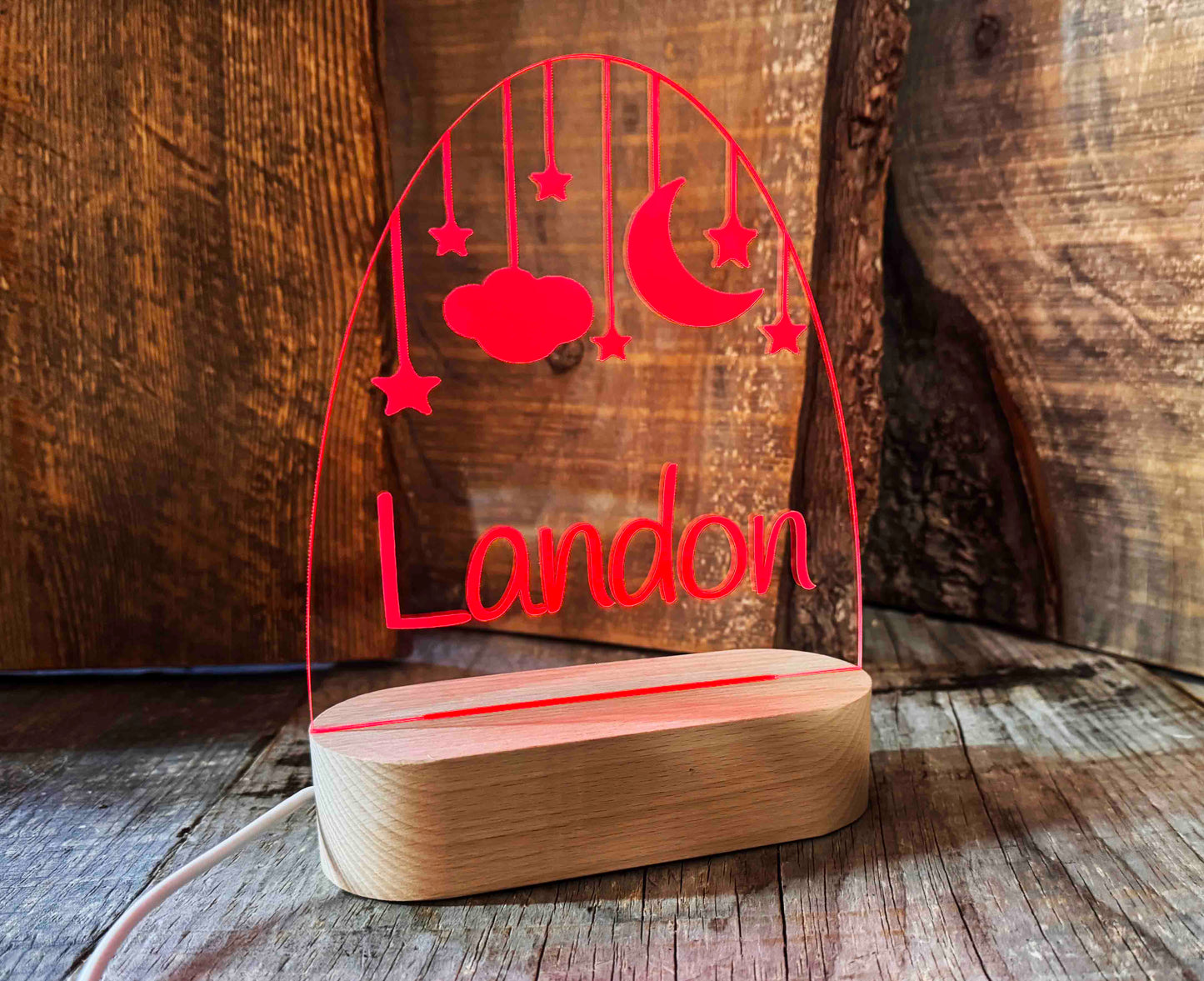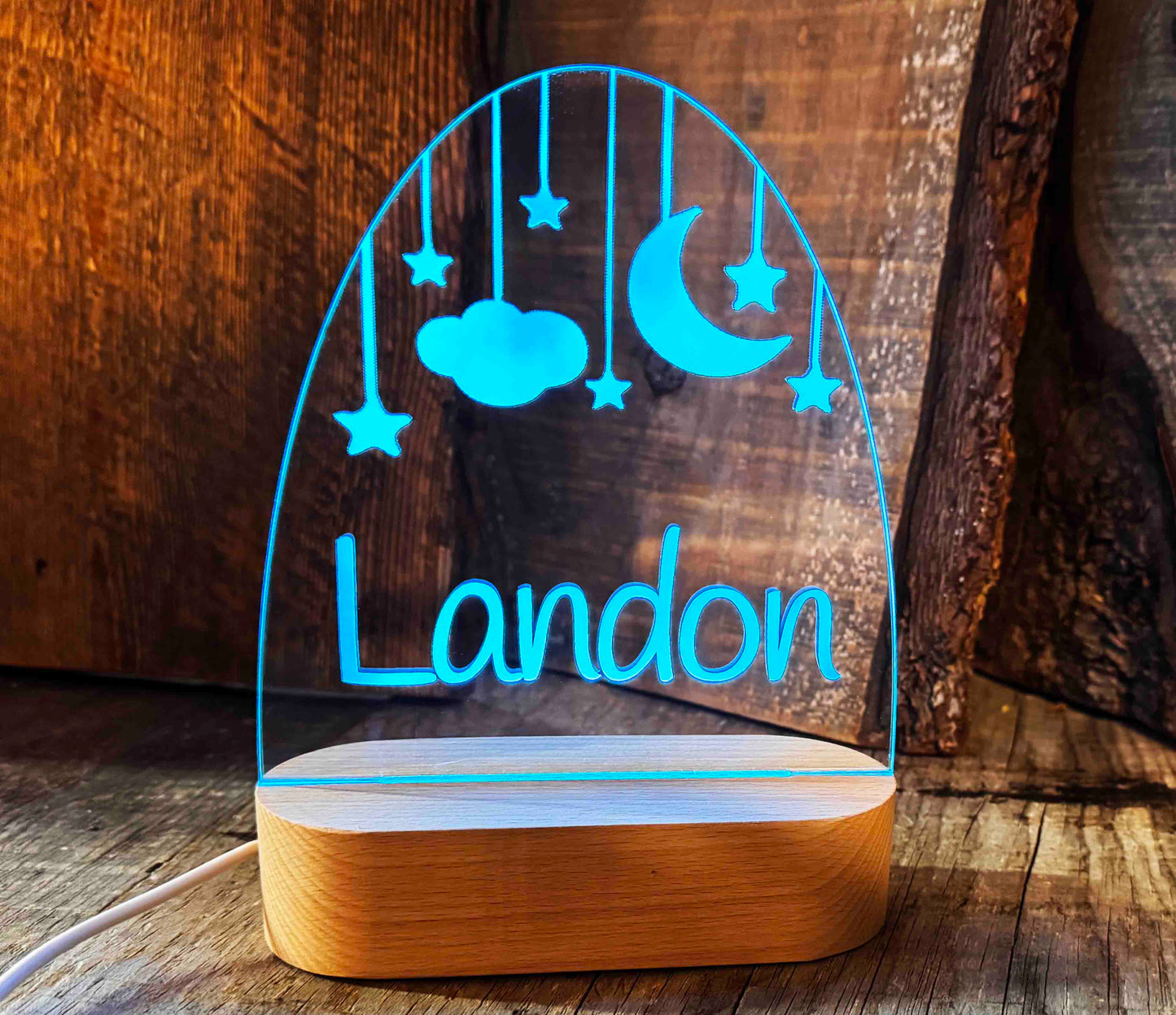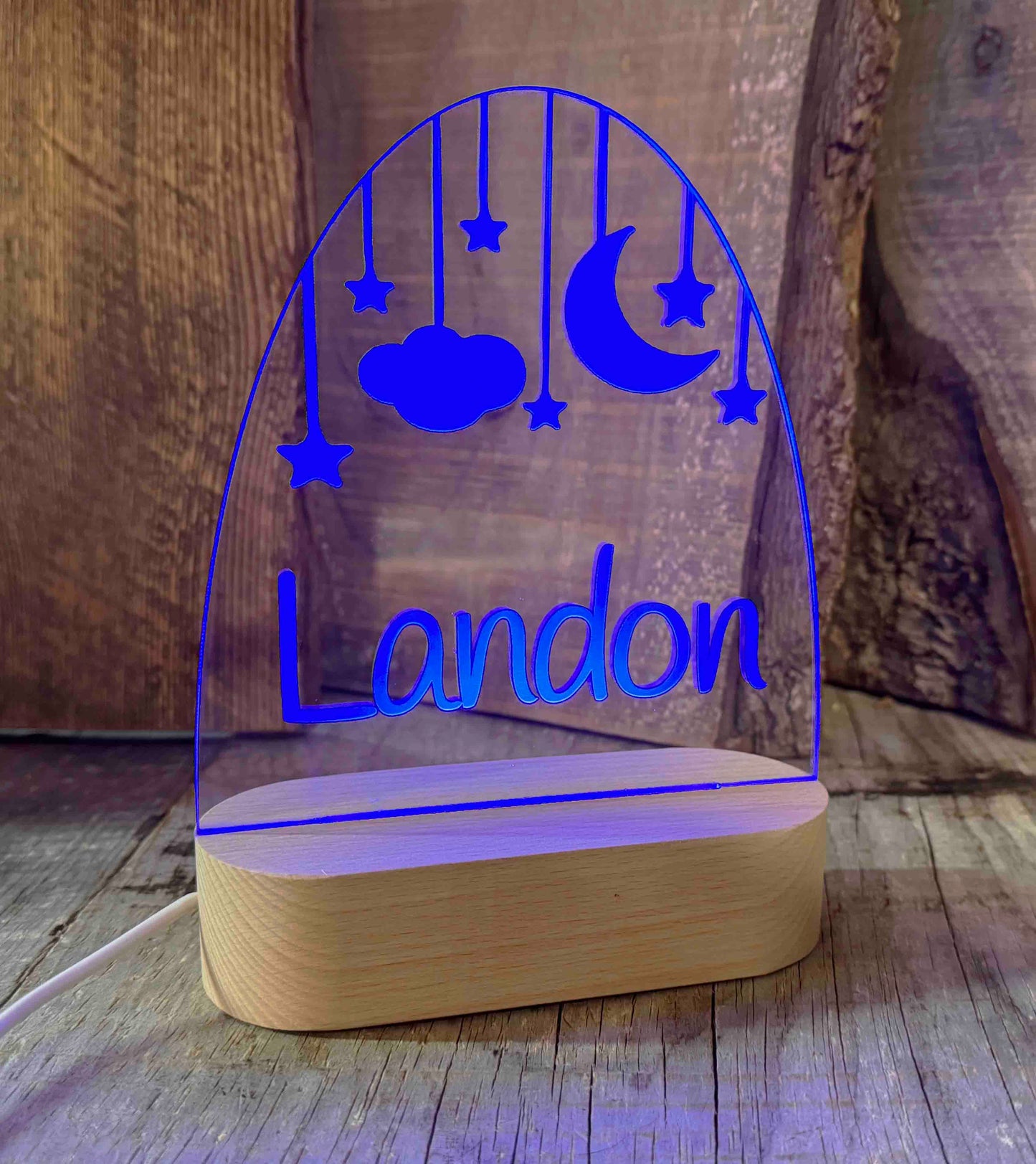 These solid birch wood and acrylic custom LED 7 color dimmable lights are laser cut and engraved creating a beautiful custom light.