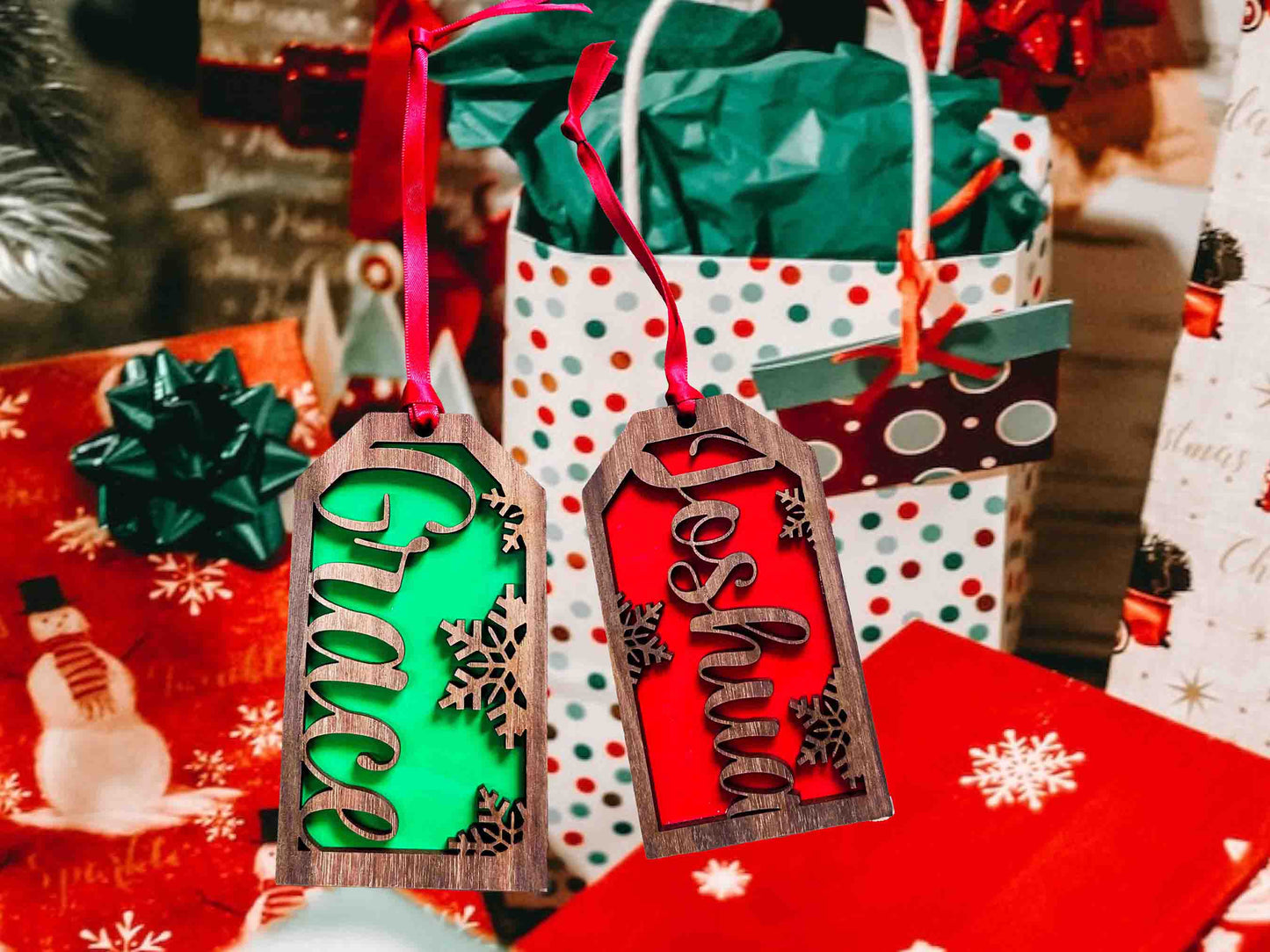 Gift Tags Custom Cut By Laser. Great personal touch for stockings or presents. Made from real Walnut Wood and Acrylic