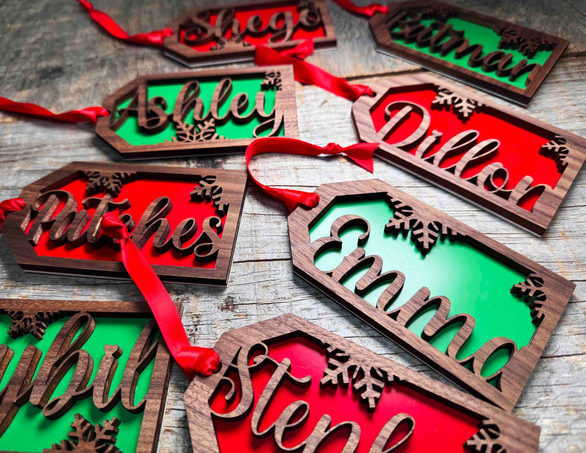 Gift Tags Custom Cut By Laser. Great personal touch for stockings or presents. Made from real Walnut Wood and Acrylic