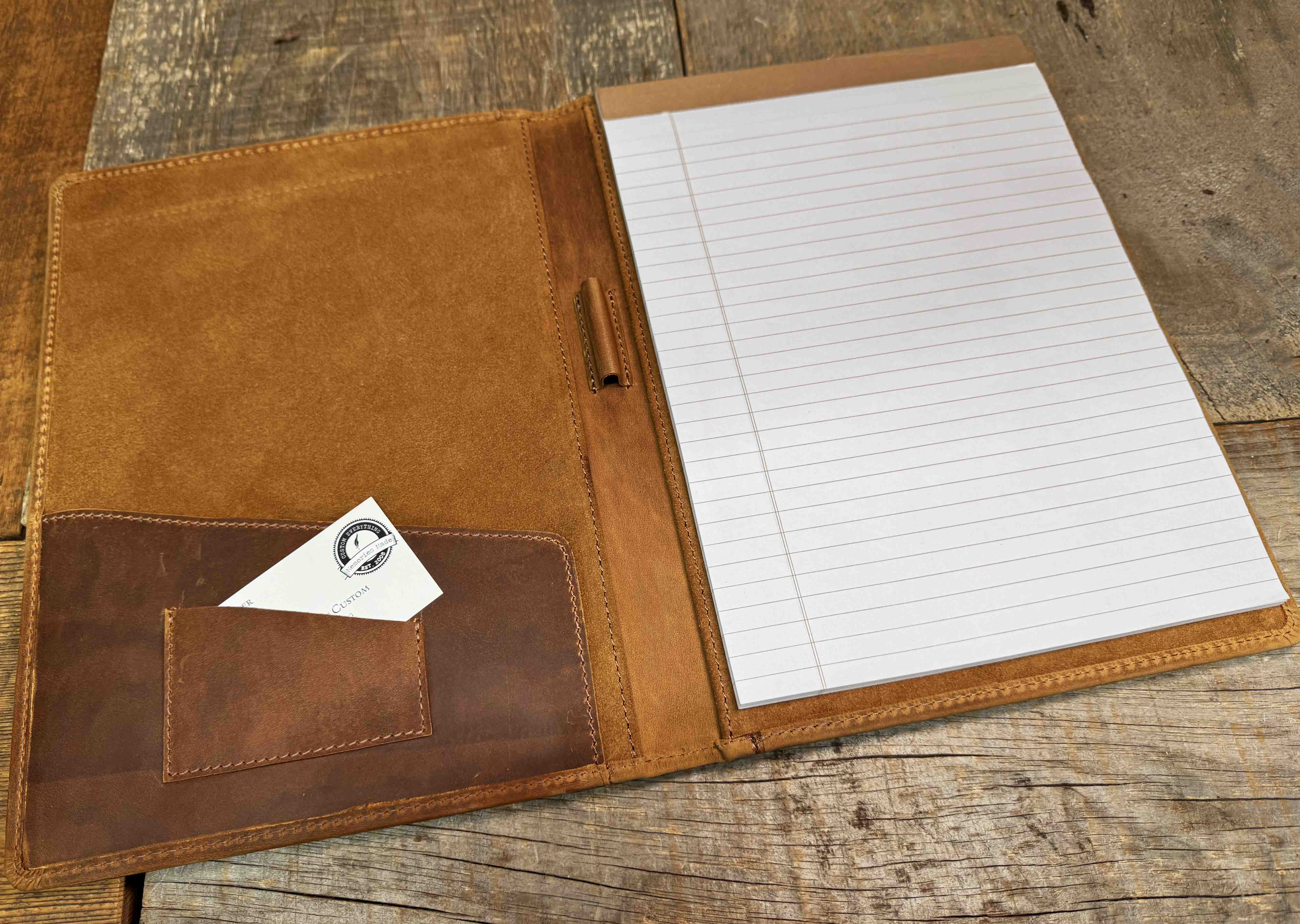 Our Premium Leather Padfolio is made from high-quality leather, ensuring durability and a luxurious feel. This padfolio is not just a stylish addition to your professional collection, but it also serves practical purposes. The fine craftsmanship results in a product that stands the test of time, providing you with a reliable companion for all your business needs. When you carry this padfolio, you’ll notice how it enhances your confidence and makes a strong impression on others.